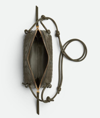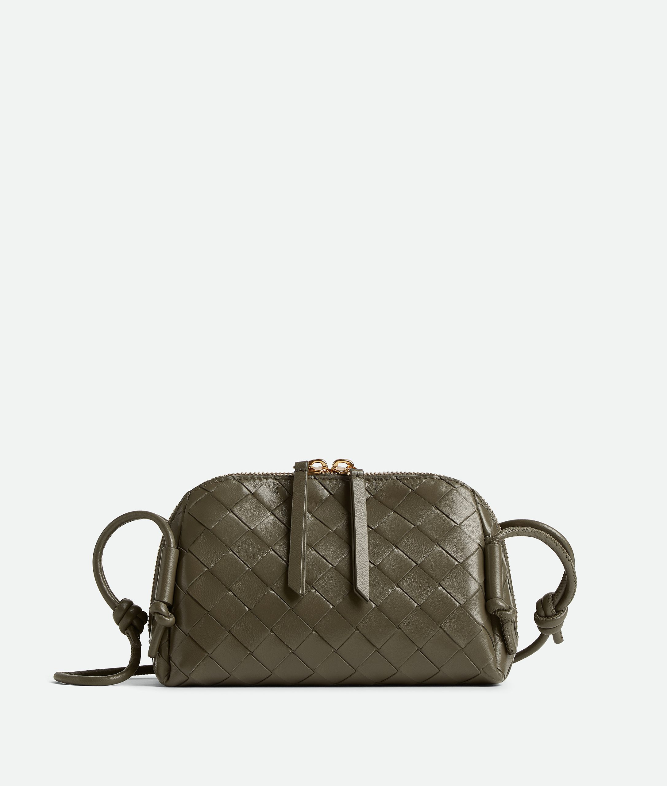 Woven nappa leather bag with adjustable shoulder strap and zipper closure. Single compartment with flat pocket inside. Adjustable leather tubular strap with sliding knots. Crafted in Cypress calfskin and lambskin with Gold hardware. • Height: 11.5 cm | 4.5" • Width: 18.5 cm | 7.9" • Depth: 8.5 cm | 3.3” Made in Italy