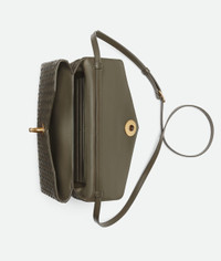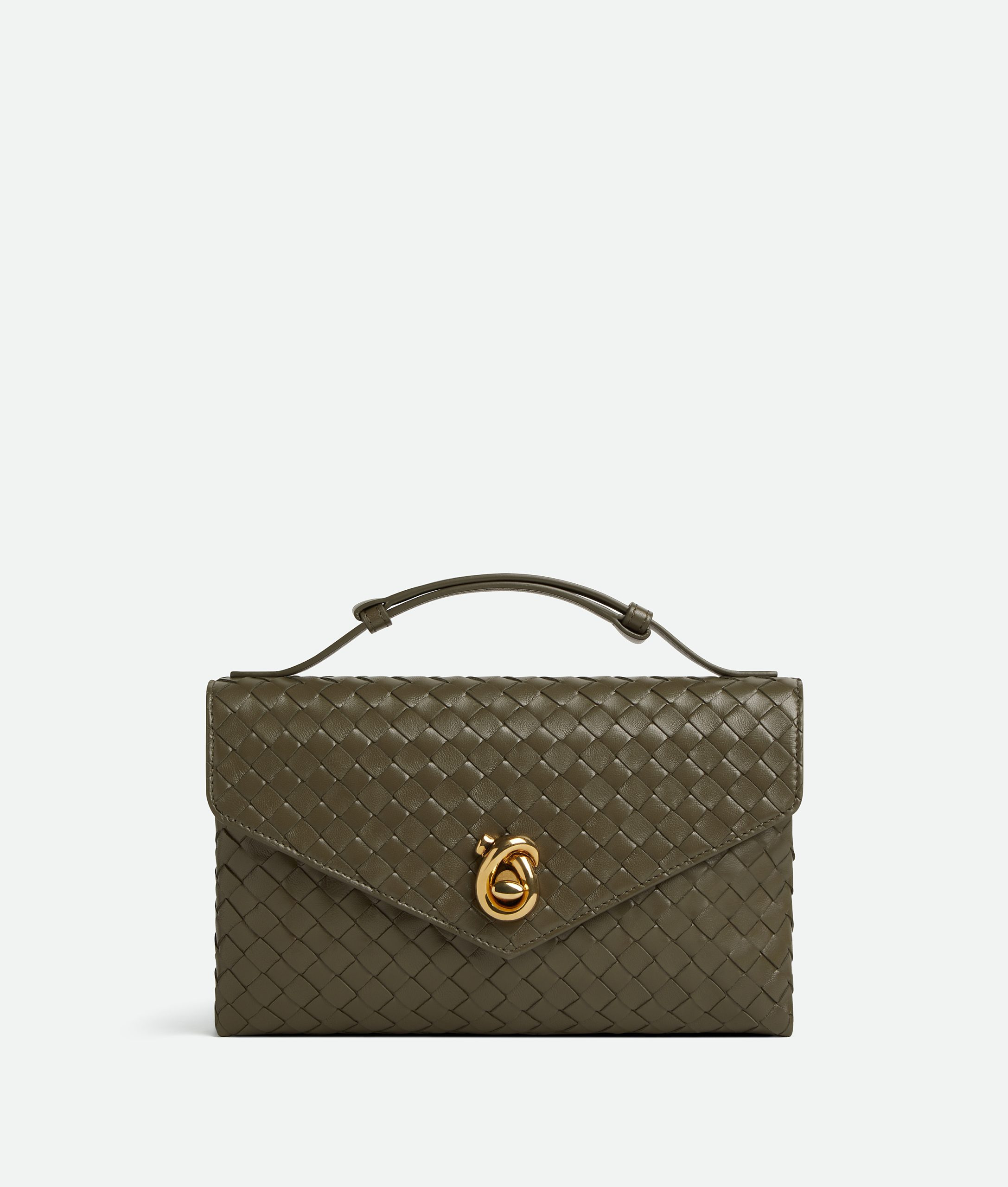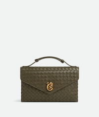 Cross body bag with top handle and adjustable and detachable leather strap. Crafted in Cypress lambskin. Inside there are two compartments plus four card slots, at the back there is one flat pocket. Metallic knot lock closure, Brass hardware, dimensions Height 16 cm | 6.3", width 25 cm | 9.8" and depth Depth: 5.5 cm | 2.2", handle drop 12cm, strap drop 46 cm | 18.1". Made in Italy