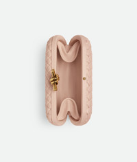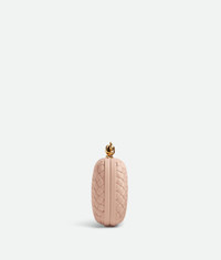 The Knot Clutch is crafted in Pink soft padded lambskin intreccio, it has single compartment and Metallic knot clasp closure. Brass hardware, dimensions: Height 11,5, width 19 and depth 5cm. Made in Italy