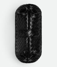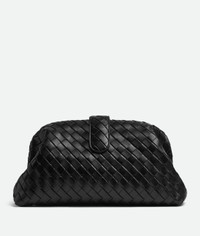 The new statement clutch, Lauren 1980 in padded Intrecciato leather. A Maxi size bag with a single compartment and magnetic flap closure. It is crafted in Black calfskin with lambskin lining. Brass hardware. Dimensions: Height 26cm (10,2In) width 54cm (21,2in) and depth 19cm (7,5in). Made in Italy.
