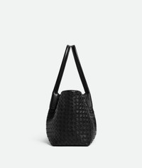Reversible tote bag in soft Black intrecciato calfskin, Removable interior pouch, Fondant suede lining, brass hardware. Dimensions: H20 W34 D14cm, shoulder drop 20cm. Made in Italy.