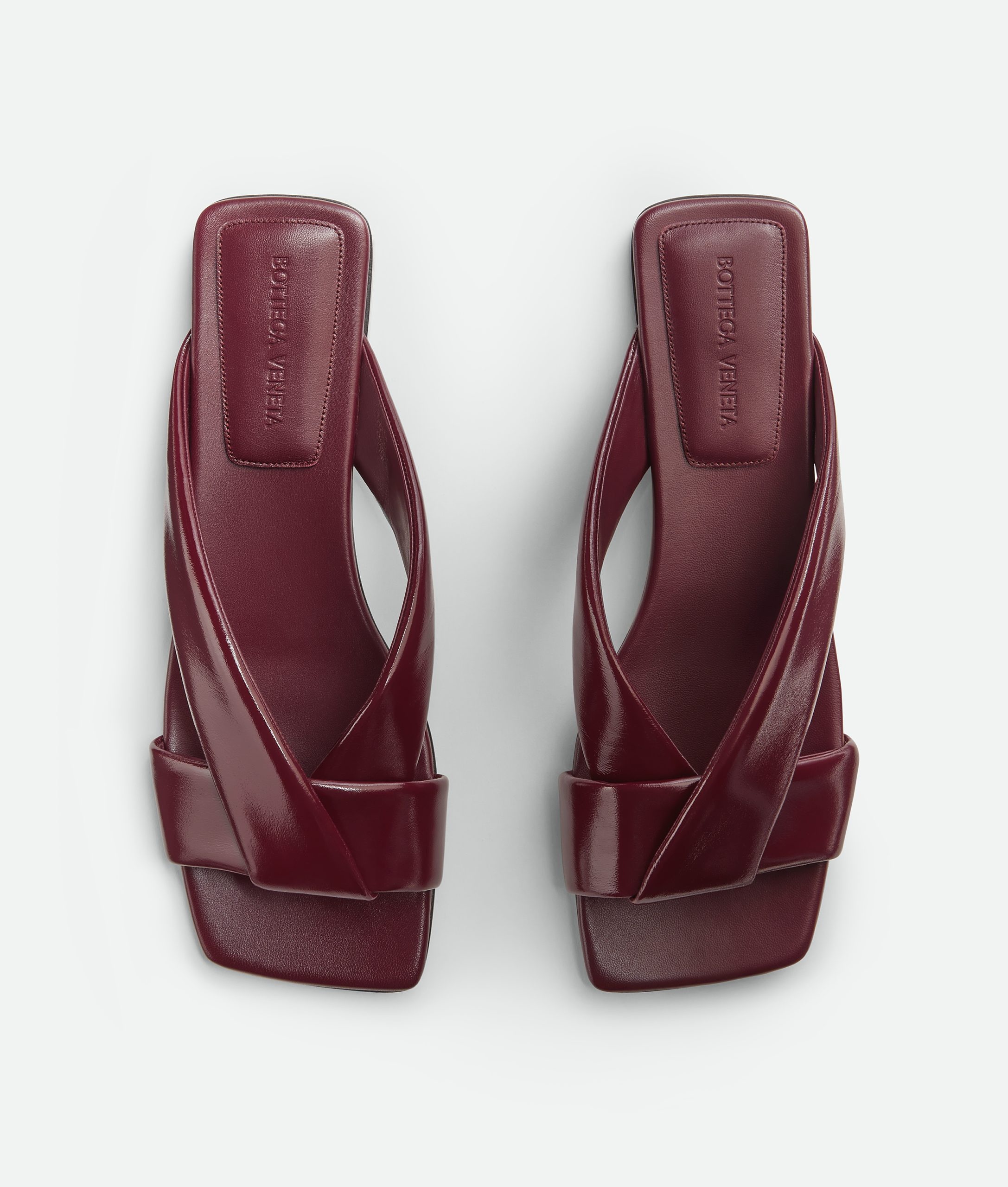 Flat Riva mule in shiny calfskin with padded tubular straps and twisted design. Crafted in Barolo calfskin, the rubber-injected leather outsole make this sandal comfortable. Made in Italy