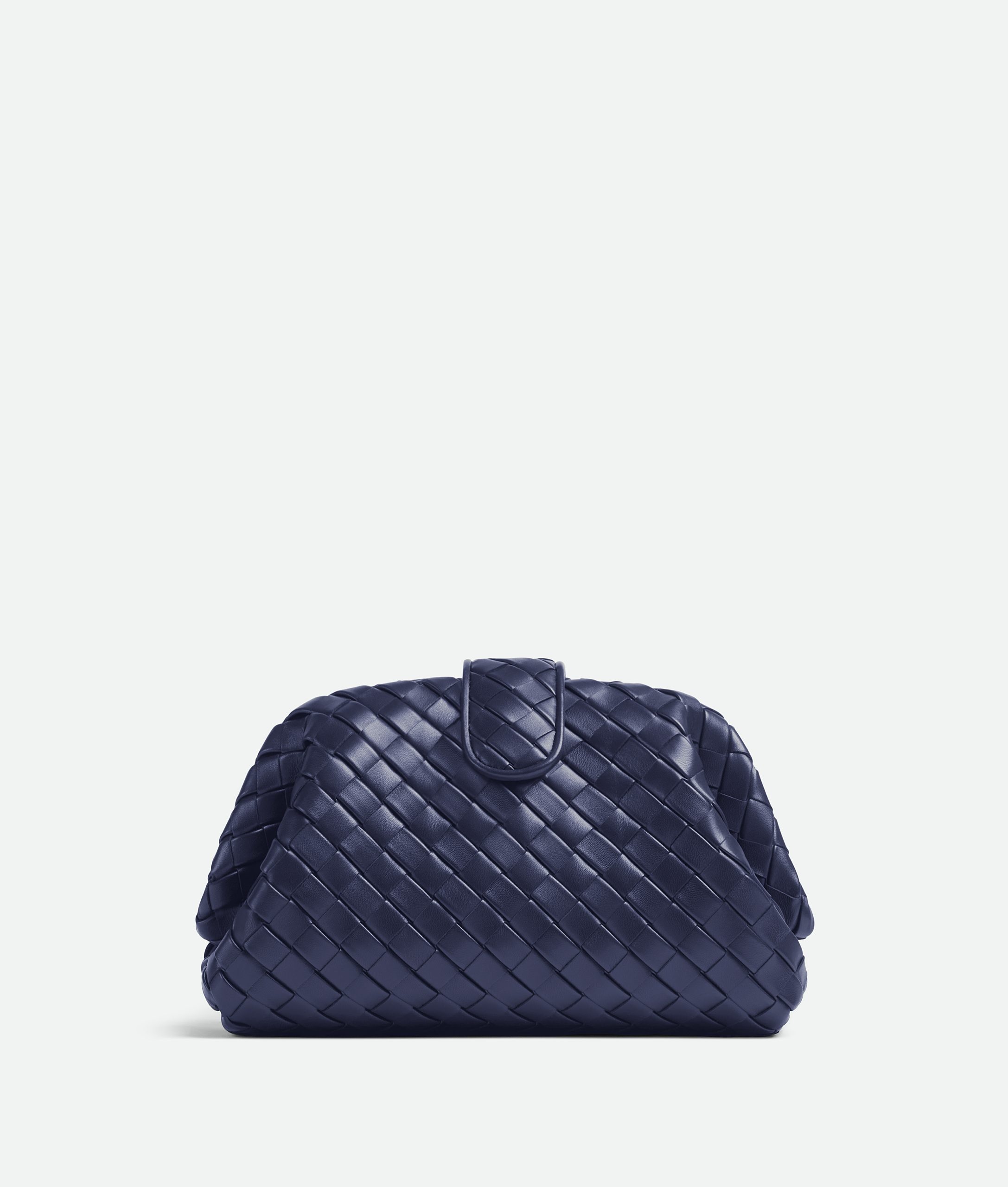 The new statement clutch, Lauren 1980 in Blue padded Intrecciato calfskin with tubular leather braided metal chain is an oversized clutch. Brass hardware. Dimensions: Height 16,5, width 31,5 and depth 11cm, strap drop 28cm. Made in Italy