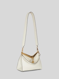 Statement Bag by Etro. A leather shoulder bag characterized by a special closure featuring a metal fastening with chain embellished by a medal. It could be worn as a shoulder bag or as a crossbody bag as it has two detachable different straps. Inside suede zipped pouch, Crafted in Bianco Latte calfskin with leather threading. Dimension: 28 x 21 x 12 cm / 11.02 x 8.26 x 4.72 inches, Short shoulder strap drop 24 cm / 9.44 inches, Long shoulder strap drop 48 cm / 18.89 inches. Pale gold-finish hardware. Made in Italy