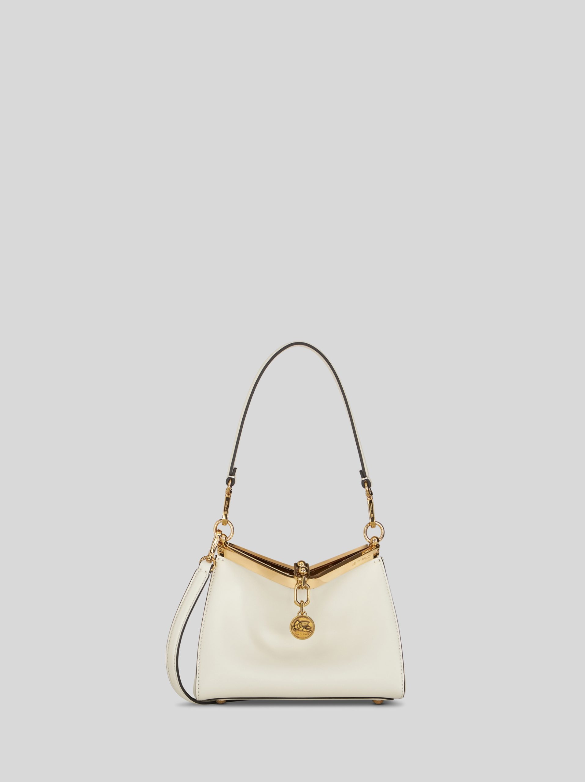 Statement Bag by Etro. A leather shoulder bag characterized by a special closure featuring a metal fastening with chain embellished by a medal. It could be worn as a shoulder bag or as a crossbody bag as it has two detachable different straps. Inside suede zipped pouch, Crafted in Bianco Latte calfskin with leather threading. Dimension: 21 x 16 x 9 cm / 8.26x 6.29 x 3.54 inches, Short shoulder strap drop 27 cm / 40.62 inches, Long shoulder strap drop 55 cm / 21.65 inches. Pale gold-finish hardware. Made in Italy