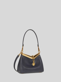 Statement Bag by Etro. A leather shoulder bag characterized by a special closure featuring a metal fastening with chain embellished by a medal. It could be worn as a shoulder bag or as a crossbody bag as it has two detachable different straps. Inside suede zipped pouch, Crafted in Blue calfskin with leather threading. Dimension: 21 x 16 x 9 cm / 8.26x 6.29 x 3.54 inches, Short shoulder strap drop 27 cm / 40.62 inches, Long shoulder strap drop 55 cm / 21.65 inches. Pale gold-finish hardware. Made in Italy