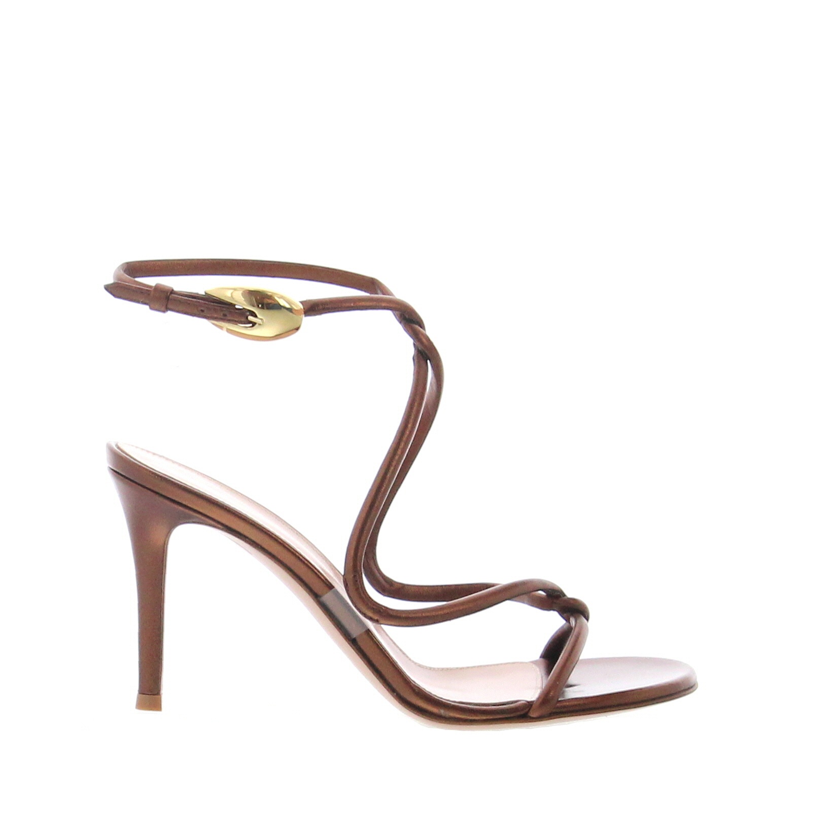 From the Jungle collection, a feminine sandal reminiscent of a snake in soft chocolate silk nappa. Set on a comfortable 85mm stiletto heel, Leather sole. Made in Italy by Gianvito Rossi.