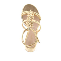 Sandal with woven t-strap and an ankle strap with leather loop closure and gold accessory. Crafted in Mekong Lambskin and set on a 45mm block heel. Leather sole. Made in Italy by Gianvito Rossi.