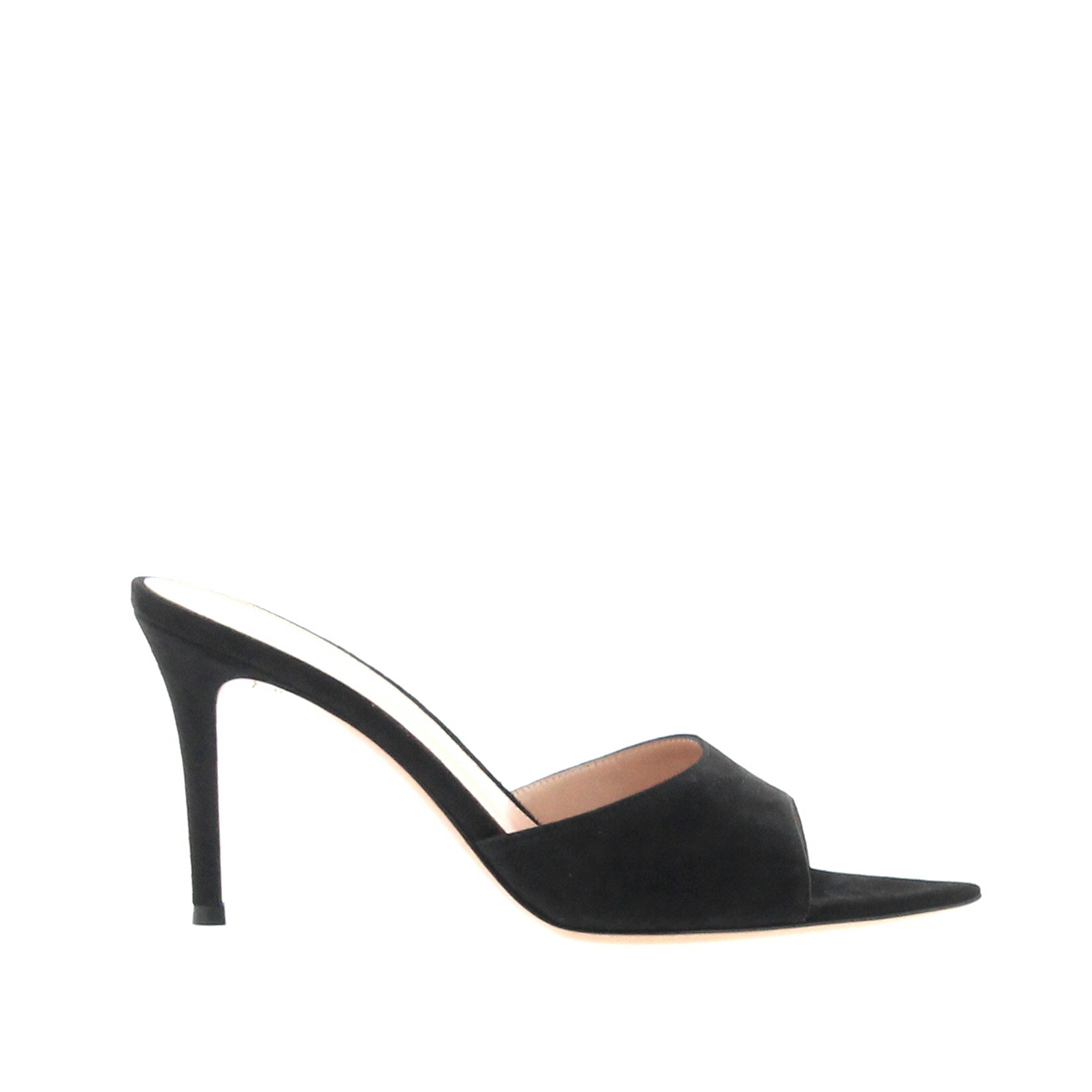 Simple mule with soft band in Black colored suede leather, mounted on an 85mm stiletto heel, pointed leather sole. Made in Italy.