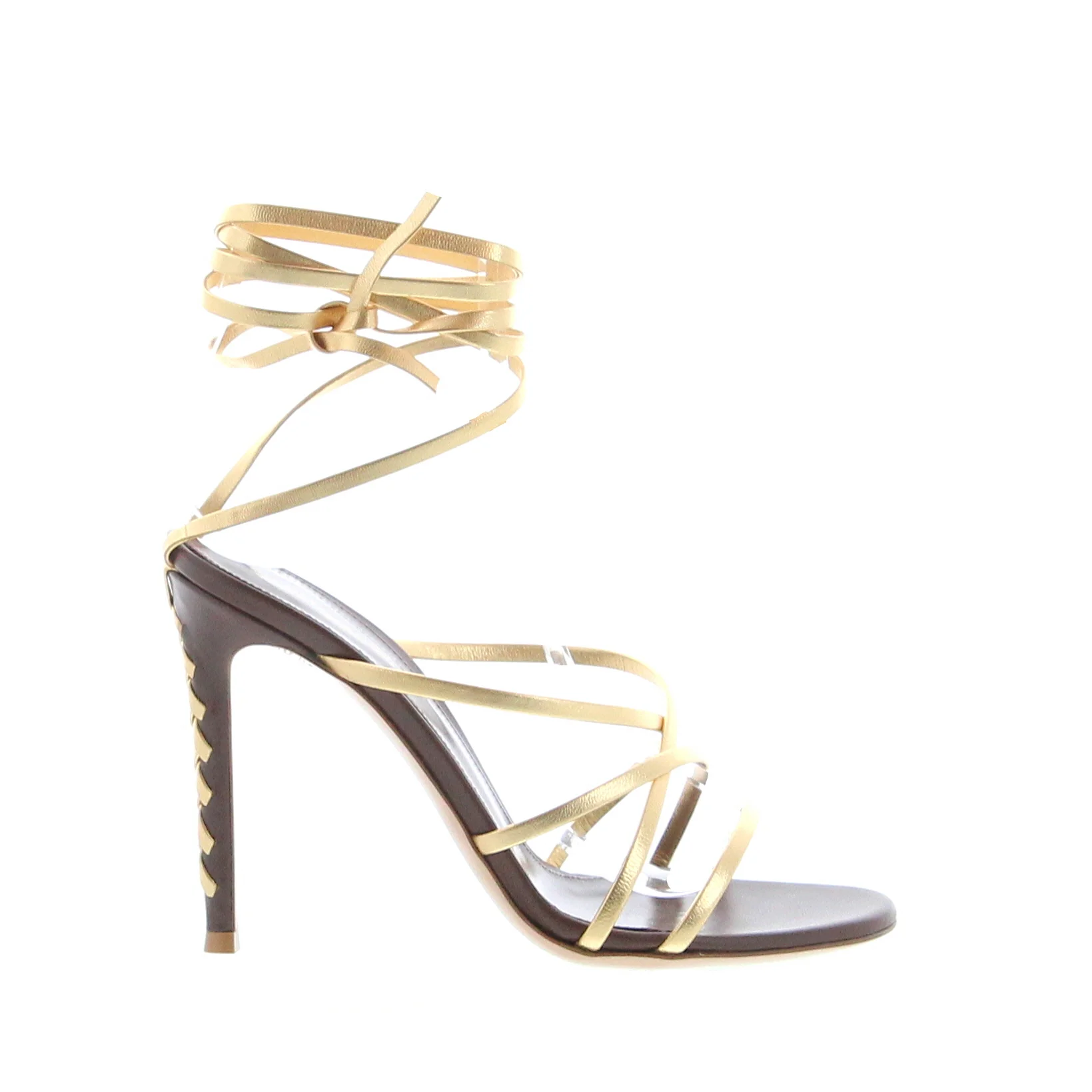 Strappy sandal with gold-trimmed stiletto heels. Crafted in soft Gold nappa leather, soft Brown leather insole. Set on a 105mm stiletto heel. Made in Italy by Gianvito Rossi.