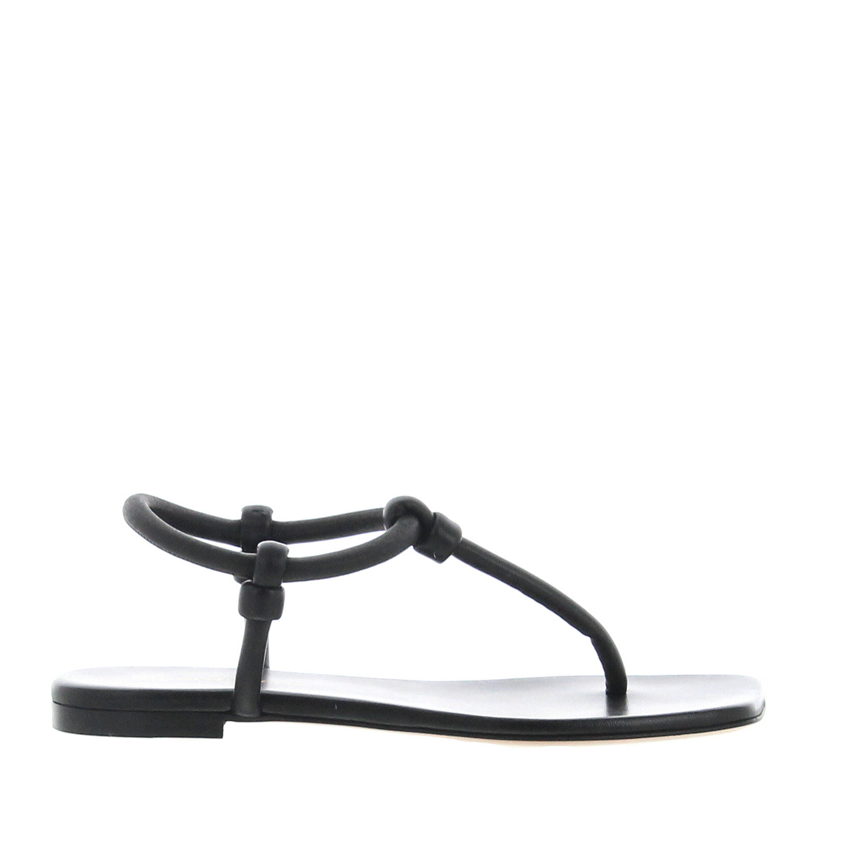 Black soft nappa sandal with leather knots and elastic ankle strap. Padded leather insole, squared leather sole. Made in Italy by Gianvito Rossi.