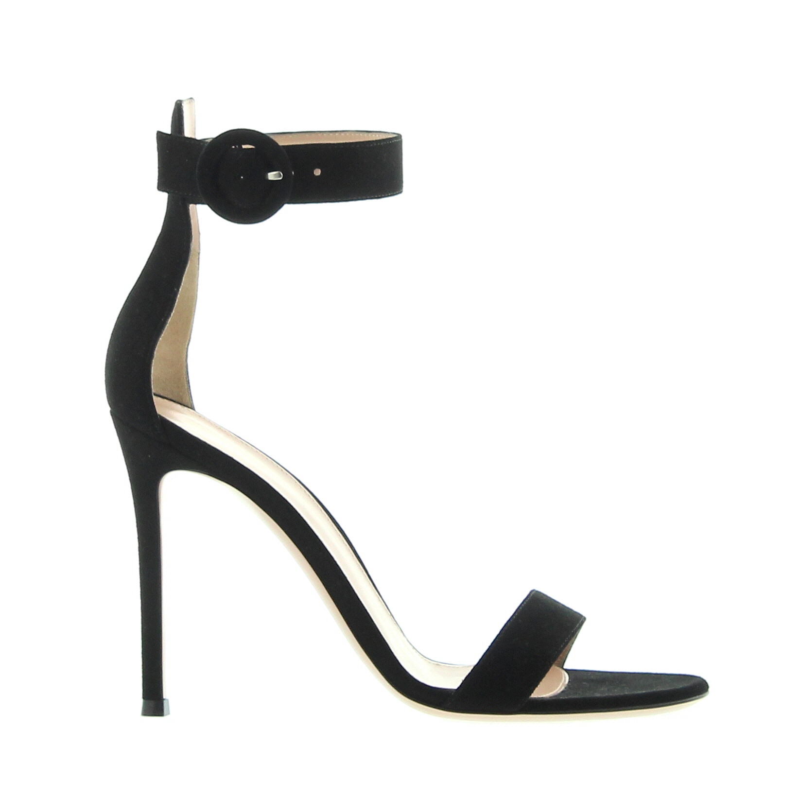 The Portofino sandal embodies elegance and charm, in black suede with a band on the toes and ankle strap on a 105mm heel. A classic must have, Made in Italy
