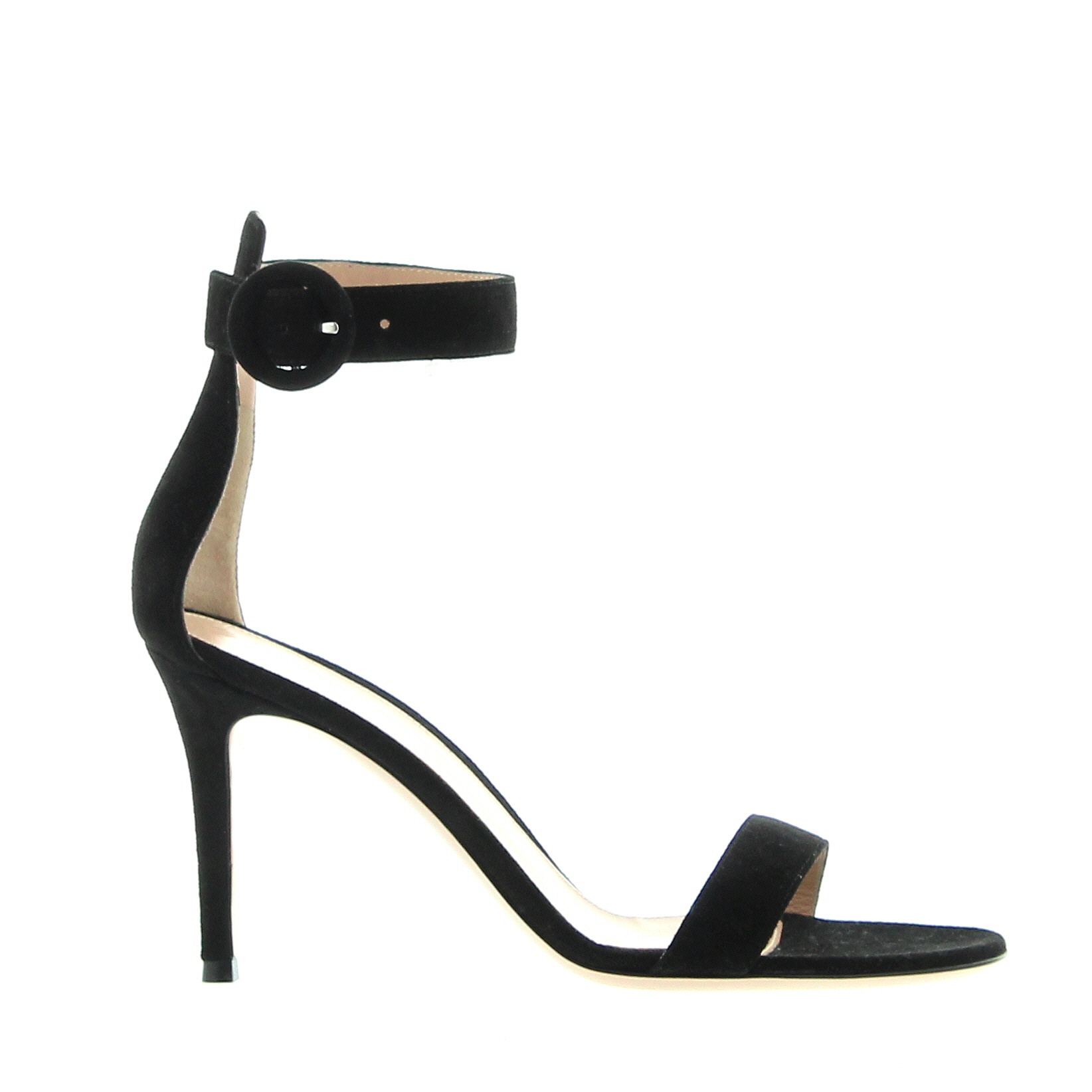 The Portofino sandal embodies elegance and charm, in black suede with a band on the toes and ankle strap on a 85mm heel. A classic must have, Made in Italy