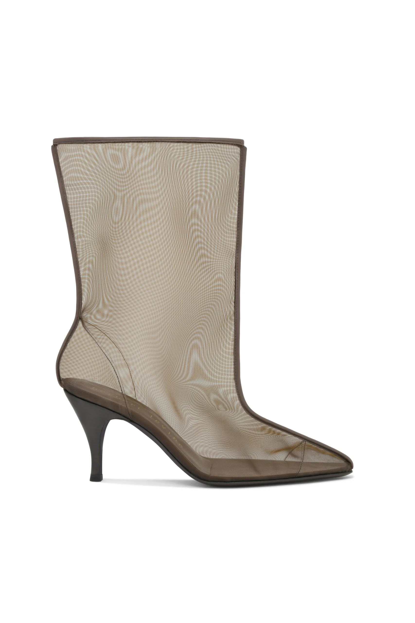 Extremely lightweight Brown mesh tube ankle boots set on a 80mm stiletto heel. Leather sole. Made in Italy.