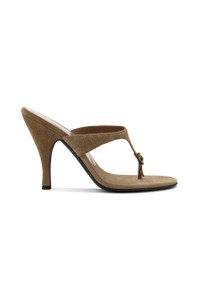 Thong sandal set on a 100mm heel. Crafted from Fandango reversed calf and embellished with a gold-plated metal buckle with stones. Leather sole. Made in Italy.