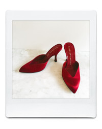 Sabot with A low V-cut, The inside of the heel is embellished with tone-on-tone rhinestones. Crafted in Beth Red satin and set on a 95mm heel. Leather sole. Made in Italy.
