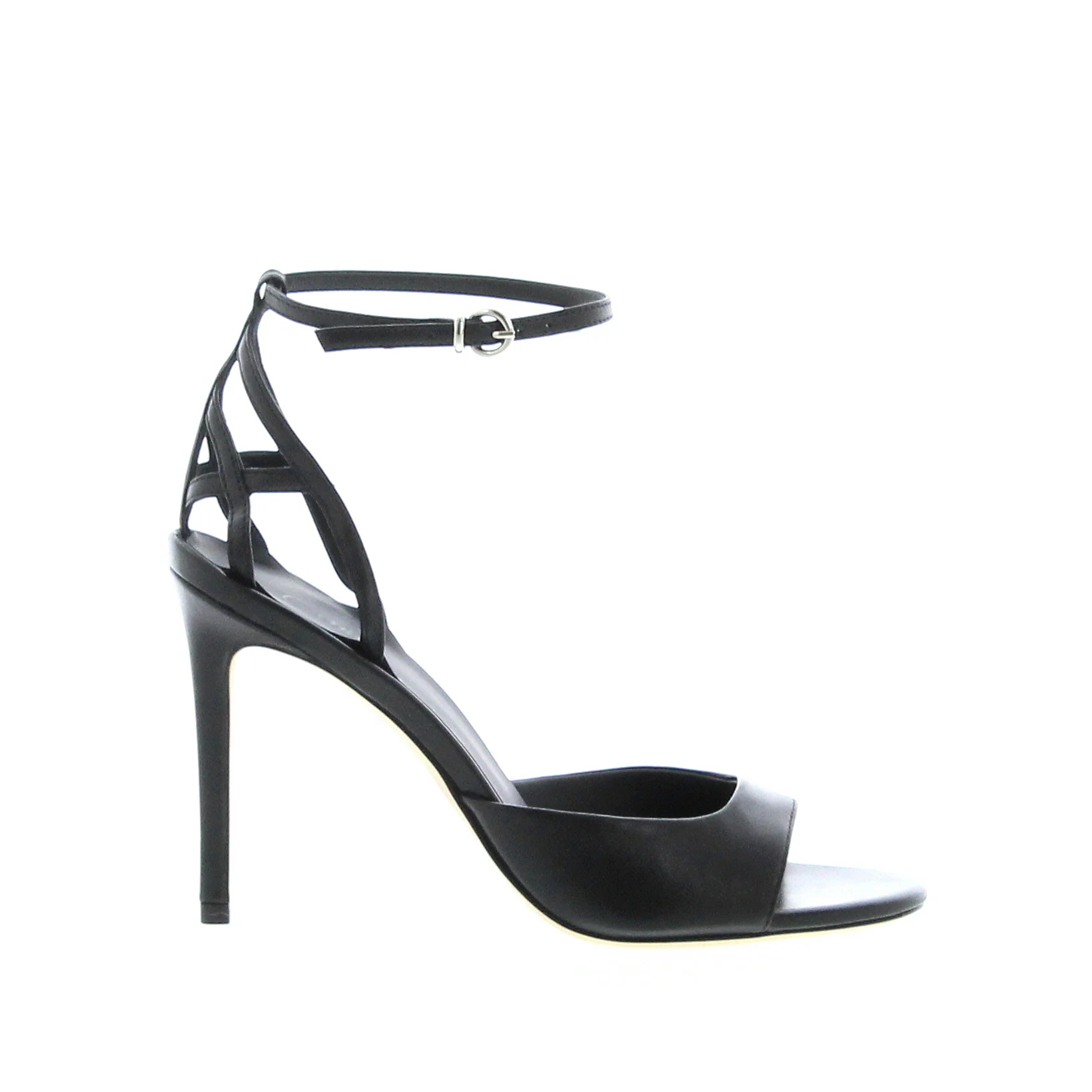 Sandal with a soft and comfortable nappa leather band, cage pattern on the heel and ankle strap. Crafted in Black nappa and Set on a 105mm heel, leather insole and leather sole. Made in Italy