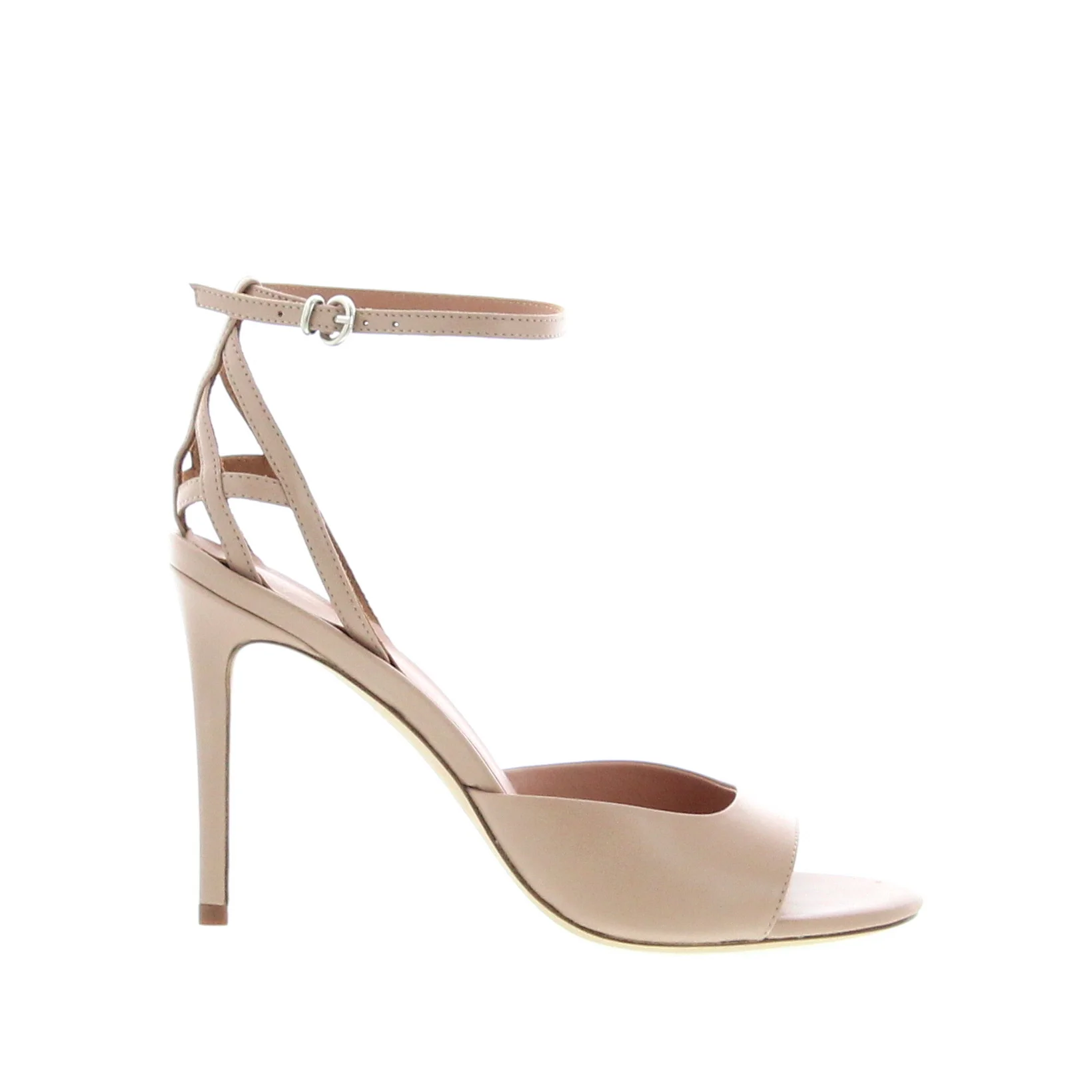 Sandal with a soft and comfortable nappa leather band, cage pattern on the heel and ankle strap. Crafted in Farro nappa and Set on a 105mm heel, leather insole and leather sole. Made in Italy