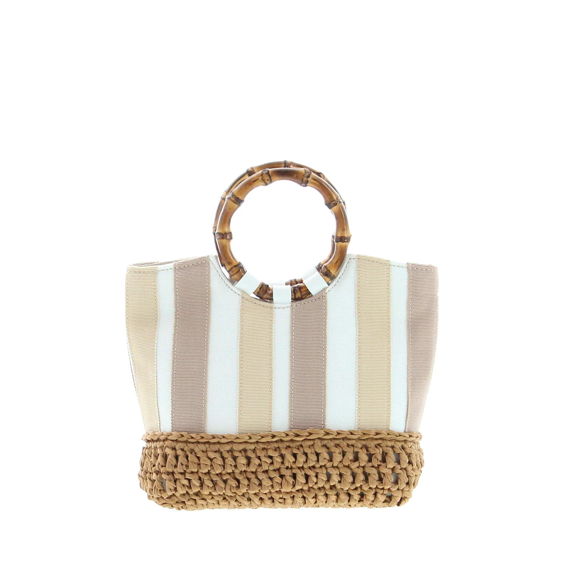 Cool rafia mini bag with White canvas and Beige stripes, Bambu Handle, leather removable white leather shoulder strap, gold-colored finishing, natural cotton lining. Handcrafted in Italy, W22cm, D8cm H18cm, handle drop 7,5cm, shoulder strap drop 50cm.