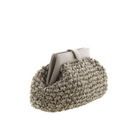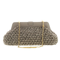 Pouch in Taupe rafia and leather trimmings, gold-colored finishing, natural satin lining. Handcrafted in Italy, W35cm, D12cm H16cm. Removable gold chain strap, drop 41cm.