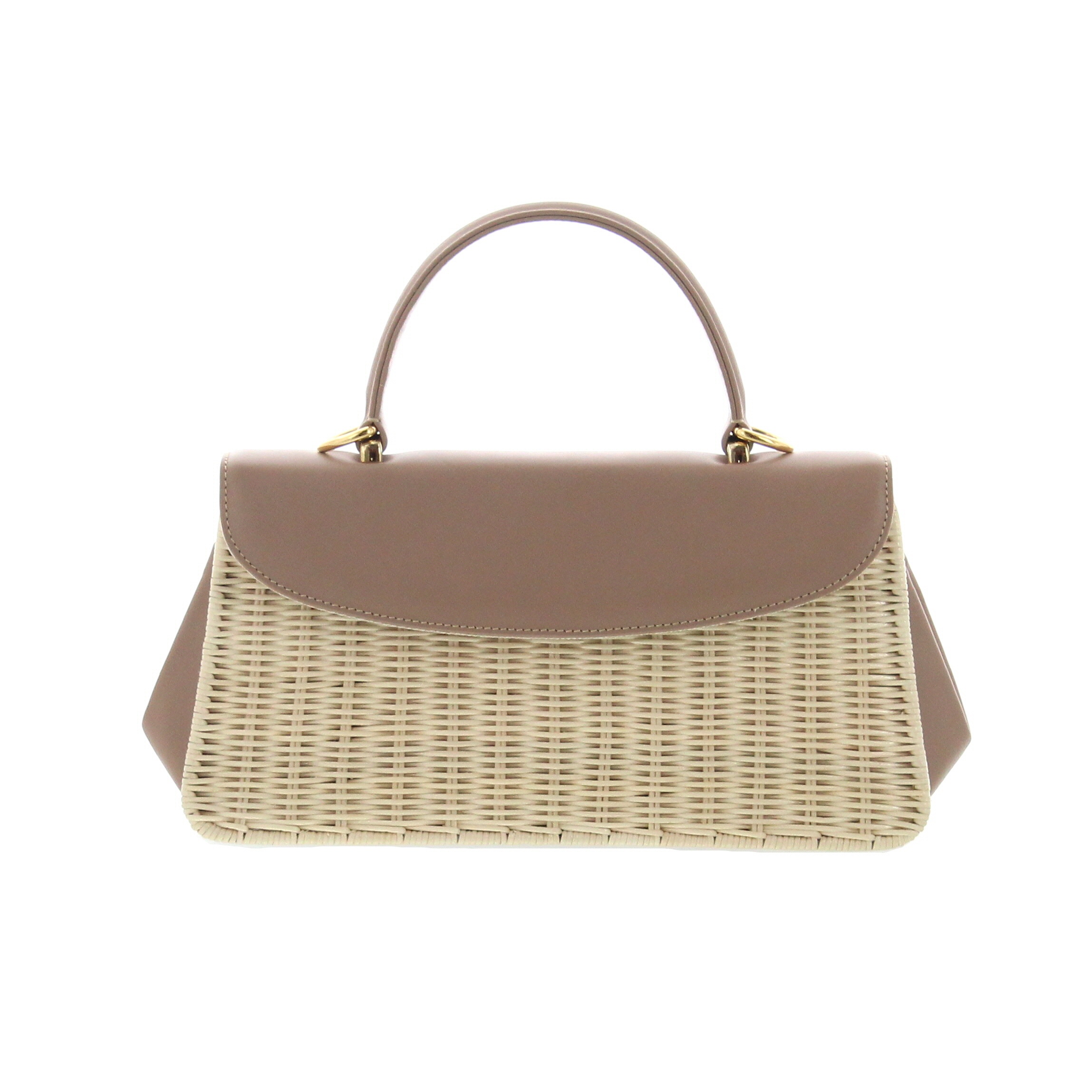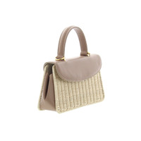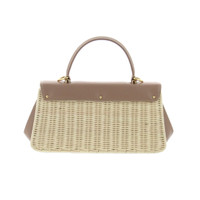 Natural shiny wicker bag with Desert leather flap and side gussets, two internal flat pockets, gold-colored hardware, removable shoulder strap in Desert leather, natural cotton lining. Handcrafted in Italy, W27cm, D7cm H14,5cm, handle drop 9cm, shoulder strap drop 58cm.