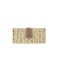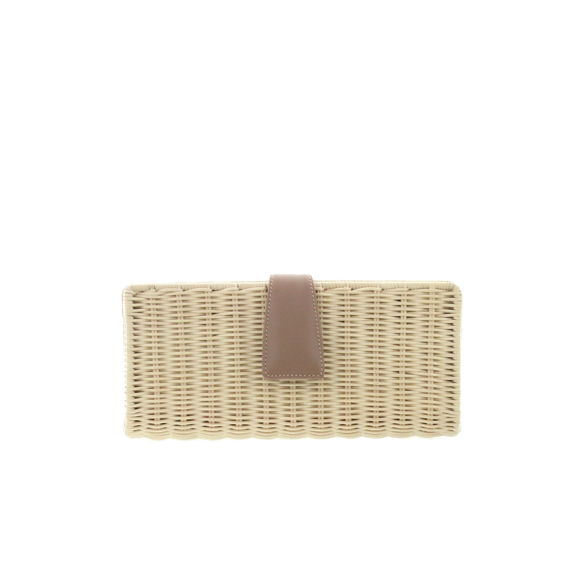 Clutch in Natural shiny wicker and Desert leather trimmings, gold-colored finishing, natural cotton lining. Handcrafted in Italy, W23cm, D6cm H10,5cm. Removable gold chain, drop 40cm.