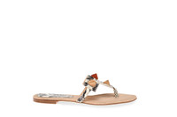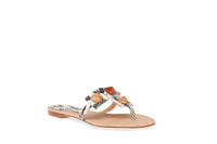 Pitone Roccia printed leather thong slide embellished with pyramid-shaped stones in shades of brown. Natural raffia insole and leather sole.. Made in Italy by Claudio Merazzi.