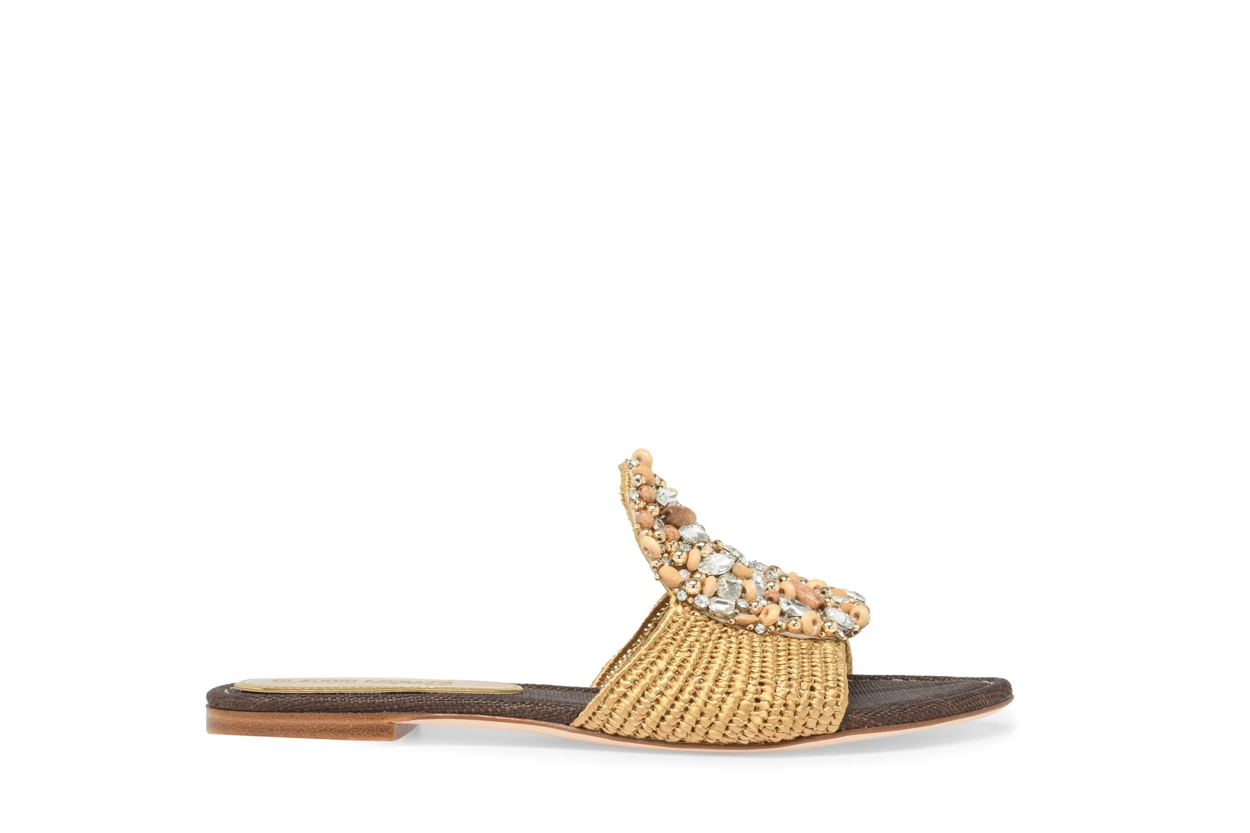 Flat mule with raffia strap in Beige, embellished with an oval accessory embroidered with wooden and gold beads and crystal rhinestones. Brown raffia insole and leather sole. Made in Italy by Claudio Merazzi.