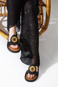 Black coloured raffia low slide with round gold metal and wood accessory. Natural-coloured padded raffia insole. Rubber sole. Made in Italy by Claudio Merazzi.