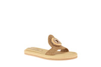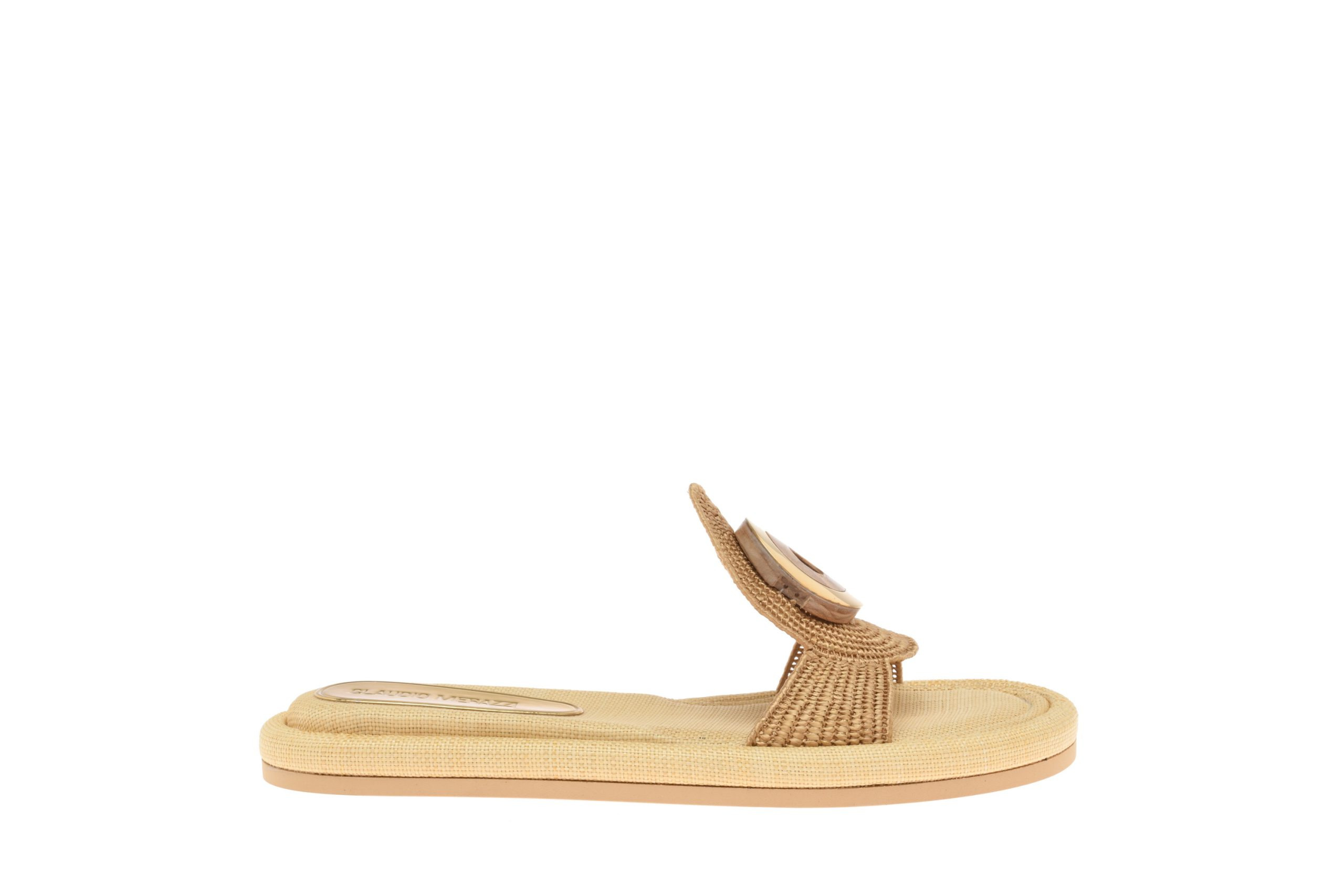 Gold coloured raffia low slide with round gold metal and wood accessory. Natural-coloured padded raffia insole. Rubber sole. Made in Italy by Claudio Merazzi.