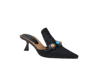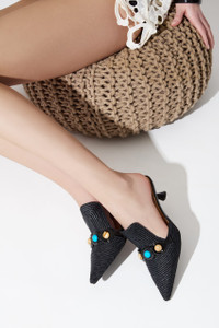Hand-woven Black raffia sabot embellished with Natural and Turquoise stones. Set on a kitten heel 55mm high. Leather sole. Made in Italy by Claudio Merazzi.