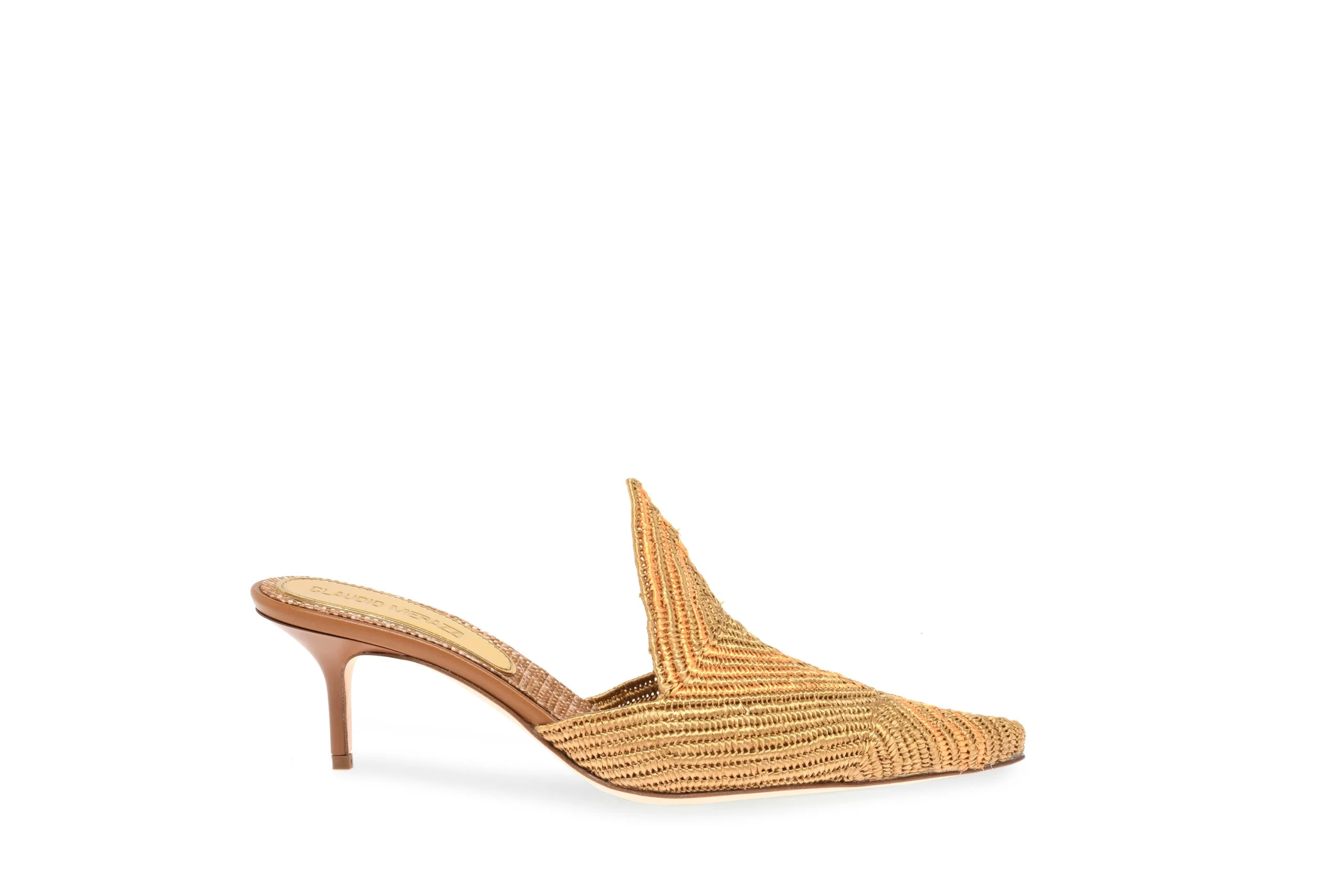 Hand-woven Beige/Gold raphia sabot. Set on a kitten heel 55mm high. Leather sole. Made in Italy by Claudio Merazzi.