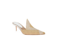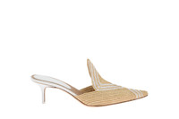 Hand-woven Natural/White raphia sabot. Set on a kitten heel 55mm high. Leather sole. Made in Italy by Claudio Merazzi.