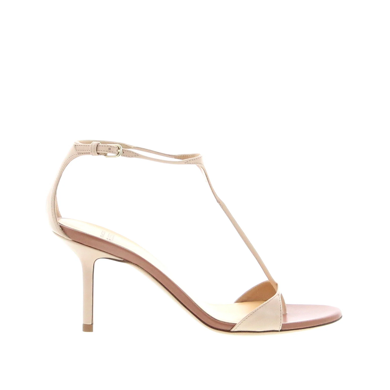 Extra thin t-strap sandal crafted in Nude leather. Gold hardware, Set on a 75mm slim heel, leather sole. Made in Italy.