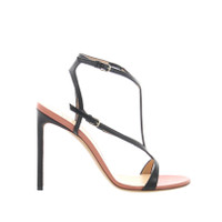 T-Bar strap sandal with leather straps forming an unusual geometric pattern. Crafted in Black kid leather and set on a 105mm stiletto heel, leather sole. Made in Italy.