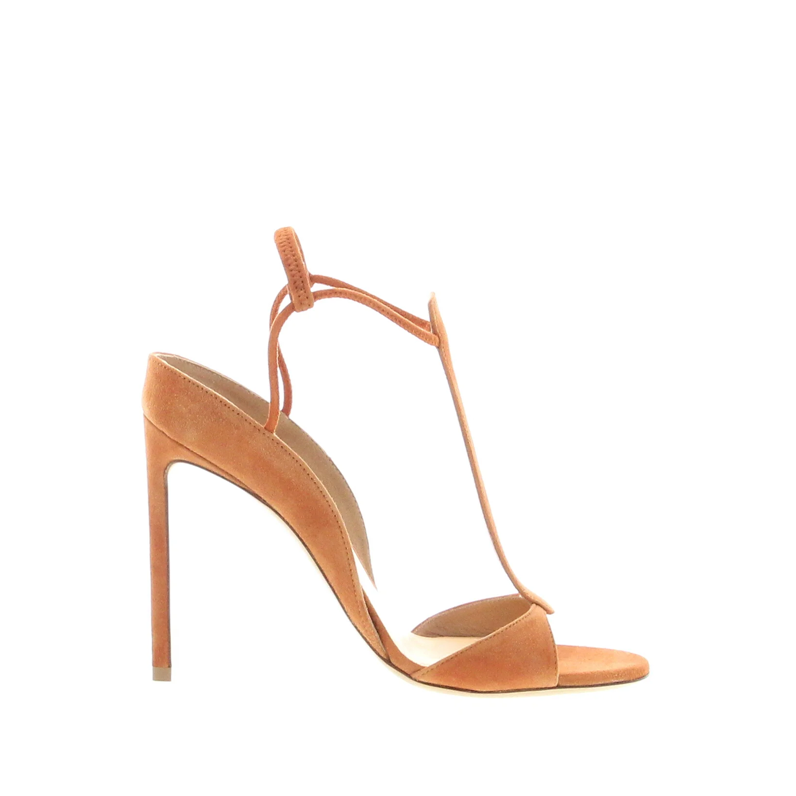 T-strap sandal with elastic ankle strap. Crafted in Pumpkin suede and set on a 105mm stiletto heel, leather sole. Made in Italy.