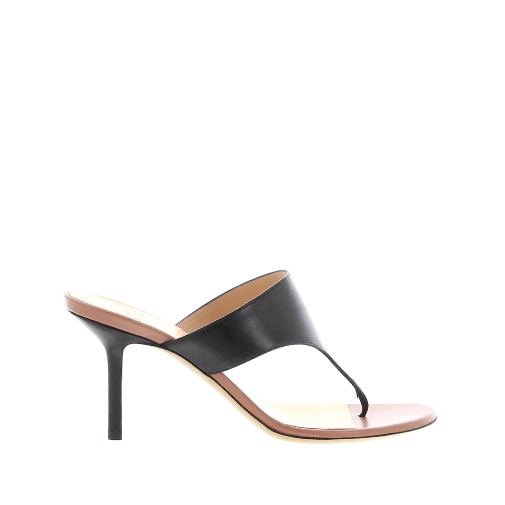 Thong sandal, crafted in Black calfskin and set on a 75mm slim heel, leather sole. Made in Italy.