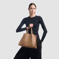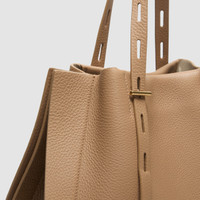 Shoulder bag with snap fastener closure, one main compartment and two flat internal pockets, one of which has a zip closure. Adjustable shoulder strap, crafted in Rose Gold grained leather, brass hardware. Dimensions: W34 H29 D13cm, W13 H11 D5in, shoulder strap drop 11/27cm. Made in Italy.