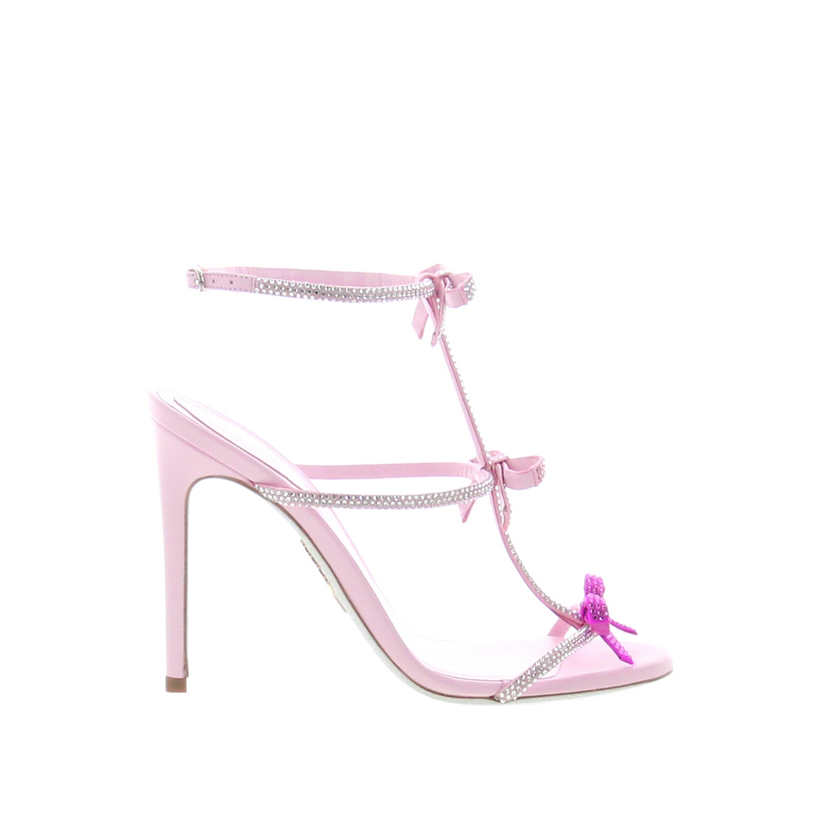 Caterina sandal crafted in Pink satin and White crystals, a T-strap design enriched with three dainty ribbons embellished with Light Pink and Fuchsia crystals entirely made by hand. Set on a 105mm stiletto heel with the signature silver-dusted sole. Made in Italy.