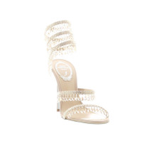 Chandelier sandal, a new icon by Rene Caovilla. It has a double strap on the instep and a third snake-shaped strap that goes up to wrap around the ankle and leg, all covered in rhinestones and with champagne-coloured pendant crystals. Crafted in Beige Satin with Gold shadow strass, set on a 105mm stiletto heel and the signature stardust sole. Made in Italy.