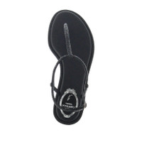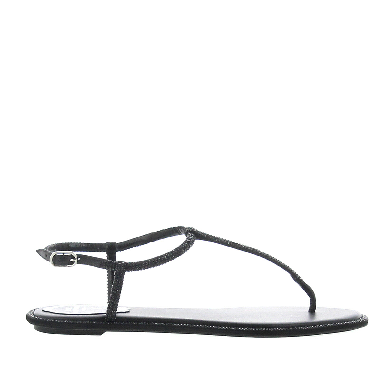 Minimalist style for the Diana flat thong sandal, crafted in Black satin and Black crystals that embellish the straps and trim the insole. Rubber sole. Made in Italy