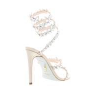 Cleo sandal, an icon to wear. It features a double instep strap and a serpente pattern that delicately encircles the ankle and leg adorned with suede flowers embellished with tone-on-tone crystals. Created in Light Beige Satin, set on a 105mm stiletto heel and the signature stardust sole. Made in Italy.