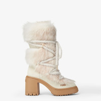 Round-toe apres-ski boots. Chunky rubber sole with wide heel and embossed Fendi logo on the back. Made of white suede with toe and shaft in tone-on-tone ‘dorsato’ shearling, characterized by a trompe-l'œil effect that mimics the full, velvety texture of fox fur. Brown rubber Fendi logo on the side. Tubular laces with gold-colored metal tips and hiking boot hooks. Gold-finish metalware. Made in Italy Composition: 100% sheep fur, 100% calf leather, inside: 100% polyester Product Code: 8W8779AYA1F1TP6