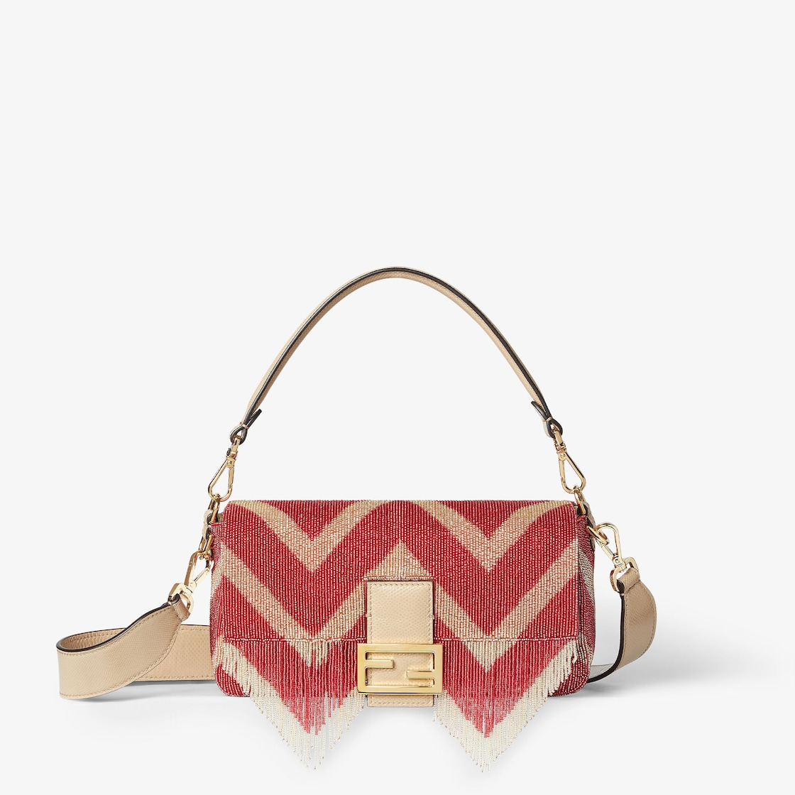 Iconic medium Baguette bag, created in 1997 that went on to become the first “It” bag. Versatile and with timeless appeal, it features the iconic underarm design inspired by the French Baguette bread from which it takes its name. Entirely embroidered by hand using light yellow and red beads that create a chevron motif, embellished with long suspended fringes. Trimmed in beige karung and embellished with an FF clasp. Featuring a front flap, magnetic clasp, red satin-lined internal compartment with a zipper pocket and gold-finish metalware. The bag can be carried by hand, or worn either on the shoulder or cross-body thanks to the karung handle and shoulder strap, both detachable. Made in Italy Composition: 100% silk, embroidery: 95% glass, 5% polyester, 100% karung snake leather, inside: 72% viscose, 8% silk Product Code: 8BR600AVN8F1U3R