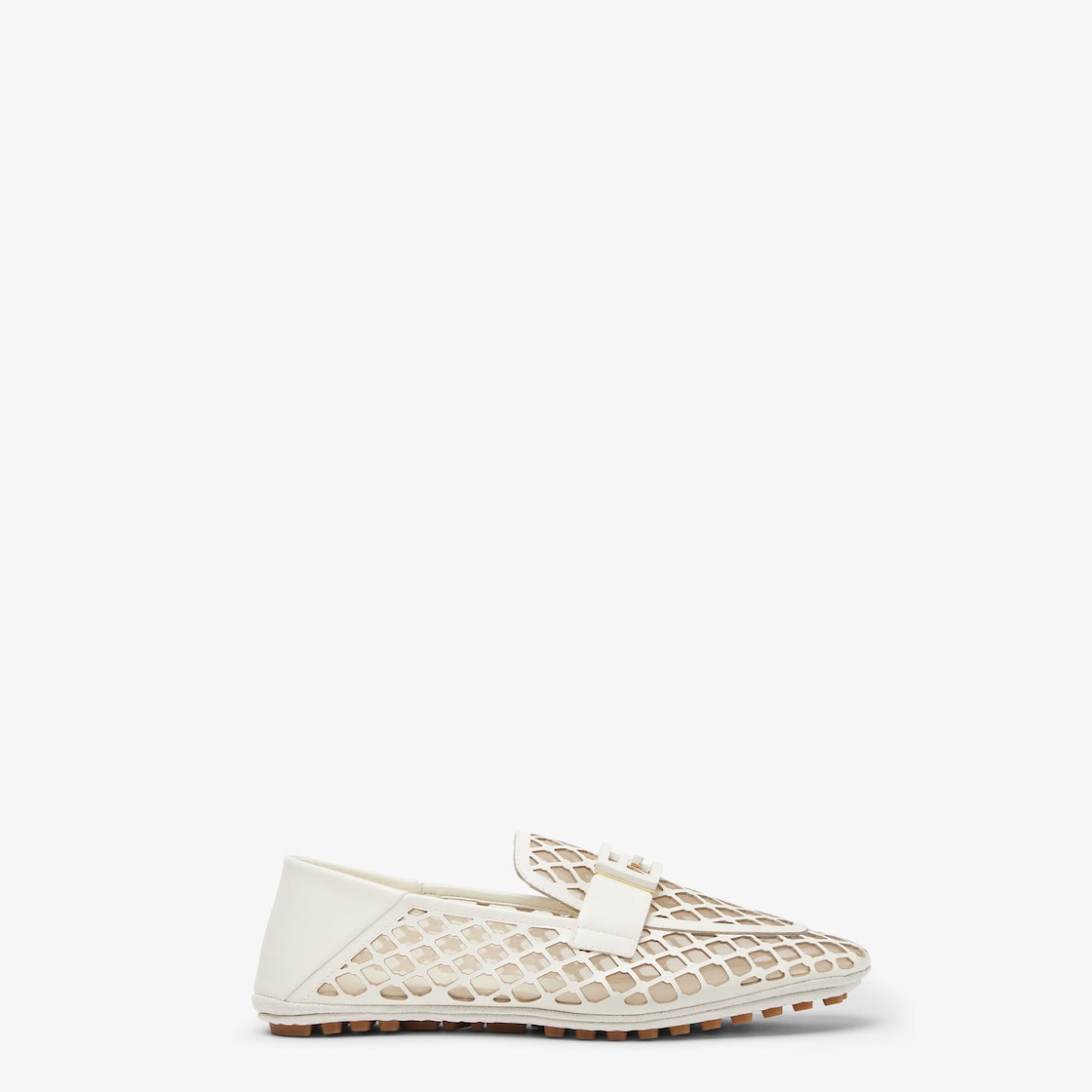 Driving loafers with FF Baguette motif. Suede sole with raised rubber inserts. The heel can be folded to wear the style as a sabot. Made of white leather with perforated motif on a base of nude-color mesh for a see-through effect. Matching enameled FF detail. Made in Italy Composition: 100% calf leather, inside: 100% sheep Product Code: 8D8514AU35F1SZR