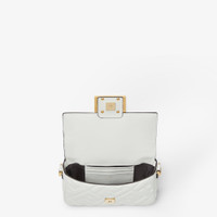 Iconic mini Baguette bag made of a particularly soft and hard-wearing, white calfskin with a 3D-effect, embossed iconic FF motif. Decorated with an FF clasp. Featuring a front flap embellished with debossed FENDI lettering, magnetic clasp, internal compartment with pocket lined in soft tone-on-tone nappa leather, and gold-finish metalware. The bag can be carried by hand or worn either on the shoulder or cross-body thanks to the handle and chain shoulder strap, both detachable. Holds a 6.7-inch smartphone, Mini Trifold card holder or wallet, keys and lipstick. Made in Italy Composition: 100% calf leather, inside: 63% cotton, 34% polyester, 3% acrylic Product Code: 8BS017AT57F15AO