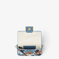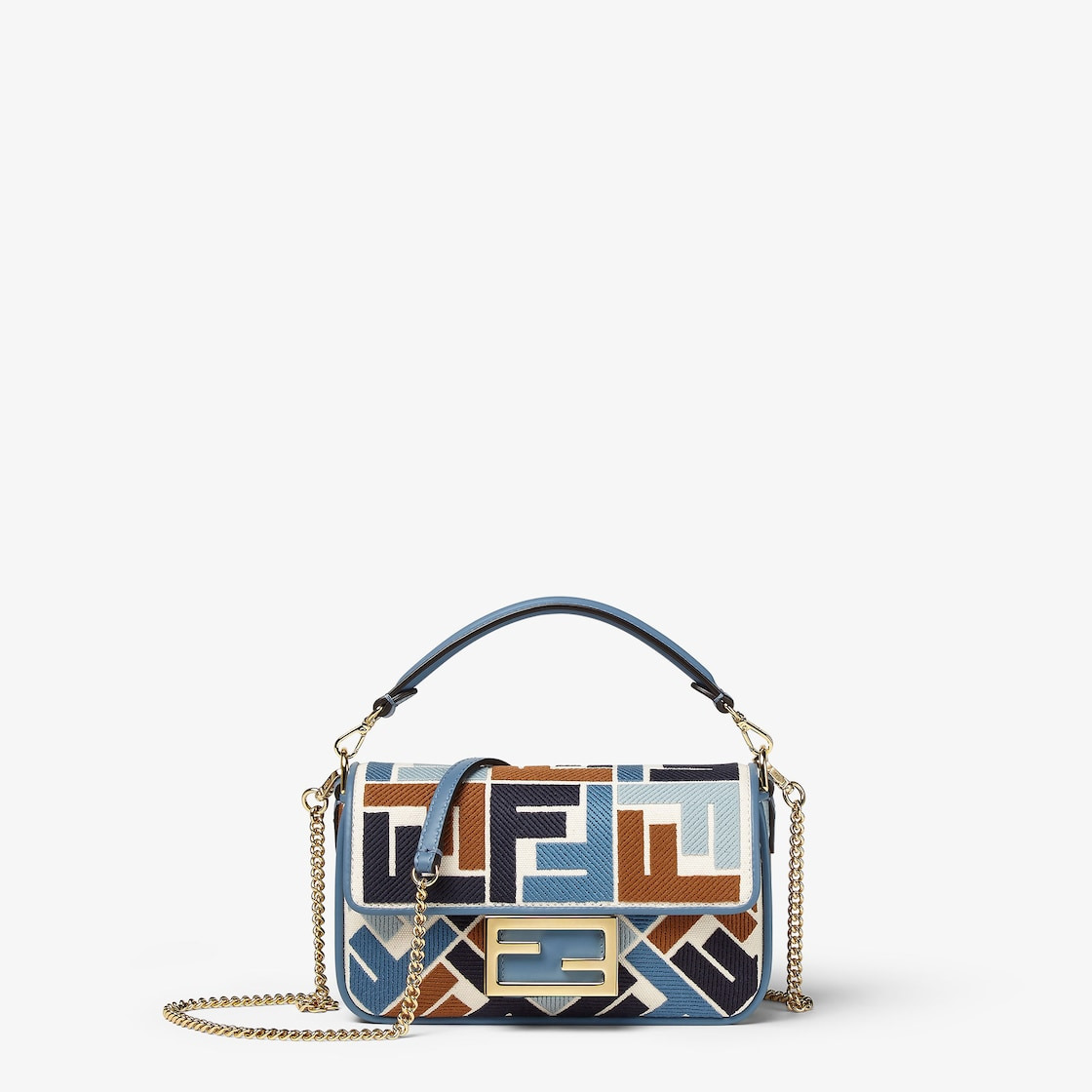 Iconic small Baguette bag made of beige canvas fabric with the iconic embossed FF motif embroidered in multicolor yarn. Trimmed with calfskin and embellished with an FF clasp. Featuring a front flap, magnetic clasp, one canvas fabric-lined internal compartment with a calfskin pocket and gold-finish metalware. The bag can be carried by hand or worn either on the shoulder or cross-body thanks to the handle and chain shoulder strap, both detachable. Holds a 6.7-inch smartphone, Mini Trifold card holder or wallet, keys and lipstick. Made in Italy Composition: 100% calf leather, embroidery: 70% polyester, 30% viscose, inside: 63% cotton, 34% polyester, 3% acrylic Product Code: 8BS017AV16F0ZEK