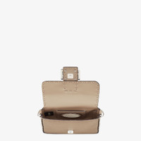 Mini iconic Baguette bag made with 309 tone-on-tone macro topstitches, an emblem of the iconic Selleria workmanship. Made of dove gray Cuoio Romano leather, calfskin with a characteristic natural grain, produced with a metal-free tanning process. Featuring a front flap, magnetic clasp, internal calfskin-lined compartment, internal pocket, silver Selleria plate, palladium-finish metalware. Decorated with an FF clasp. The bag can be carried by hand or worn on the shoulder thanks to the handle and shoulder strap, both detachable. Made in Italy Measurements: - Height : 13 cm - Depth : 5 cm - Width : 20 cm - Weight : 0.36 kg Composition: 100% calf leather, inside: 100% sheep leather Product Code: 8BS017ARBBF04Y9