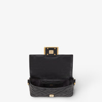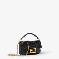 Iconic mini Baguette bag made of a particularly soft and hard-wearing, black calfskin with a 3D-effect, embossed iconic FF motif. Decorated with an FF clasp. Featuring a front flap embellished with debossed FENDI lettering, magnetic clasp, internal compartment with pocket lined in soft tone-on-tone nappa leather, and gold-finish metalware. The bag can be carried by hand or worn either on the shoulder or cross-body thanks to the handle and chain shoulder strap, both detachable. Holds a 6.7-inch smartphone, Mini Trifold card holder or wallet, keys and lipstick. Made in Italy Composition: 100% calf leather, inside: 63% cotton, 34% polyester, 3% acrylic Product Code: 8BS017AT57F15ZW
