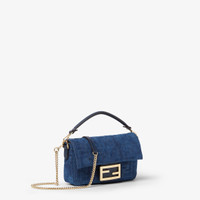 Small-size iconic Baguette® bag made of blue FF denim with a flocked texture. Decorated with an FF clasp. Features a front flap, magnetic clasp, internal compartment lined in flocked denim with a pocket and vintage gold-finish metalware. The bag can be carried by hand or worn either on the shoulder or cross-body thanks to the handle and chain shoulder strap, both detachable. Holds a 6.7-inch smartphone, Mini Trifold card holder or wallet, keys and lipstick. Made in Italy Composition: 52% cotton, 12% viscose, 32% polyester, 4% elastane, 100% calfskin, inside: 85% cotton, 15% viscose Product Code: 8BS017AVR6F1UJW